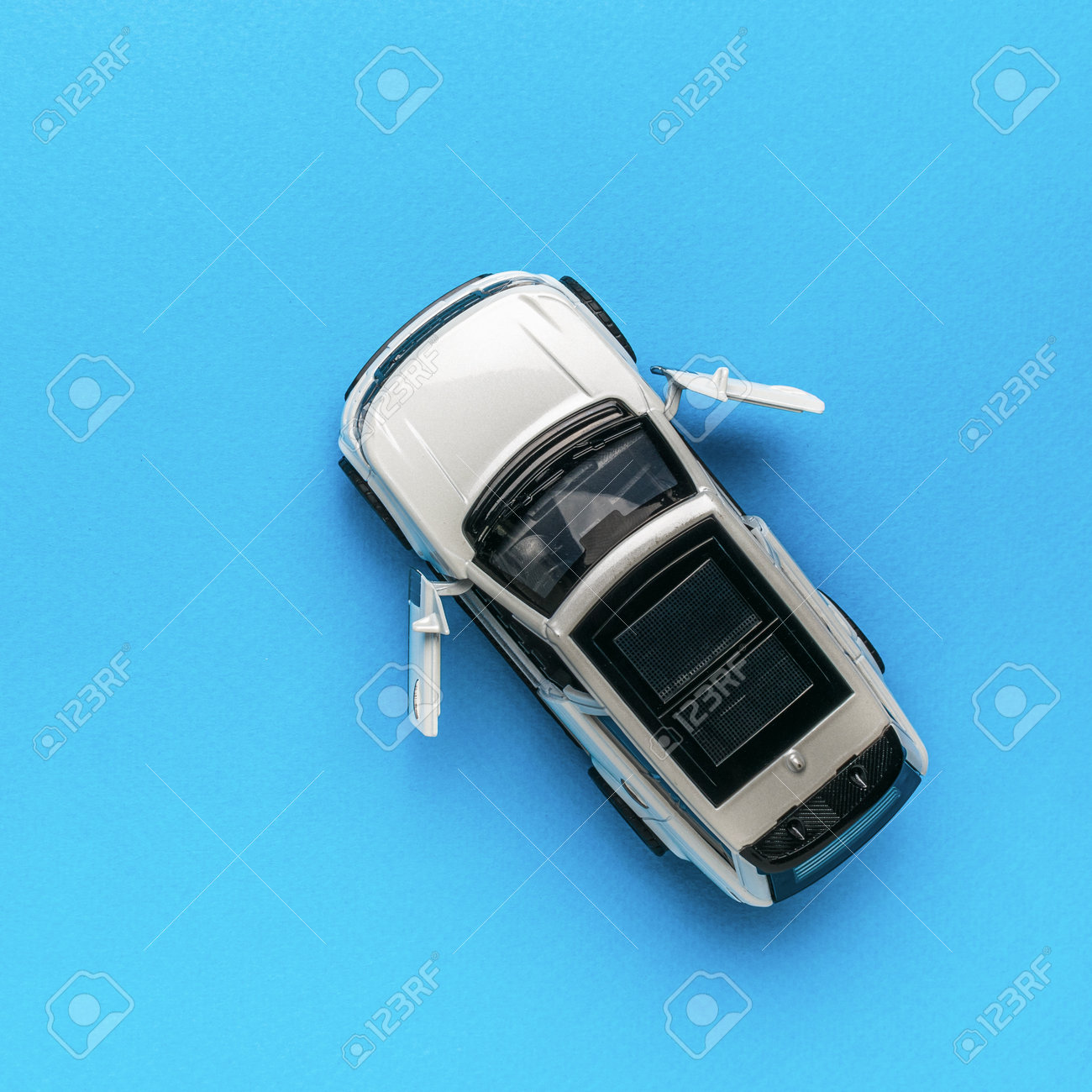 Top view of a white suv with open doors on a blue background the concept of auto mania flat lay